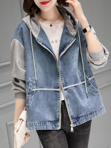 连帽牛仔外套女韩版春秋新款潮宽松拼接休闲拉链上衣棒...