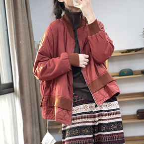 棉麻碎花加绒短款外套女秋冬复古民族风立领宽松休闲夹...