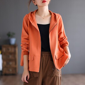 2020秋冬新款加厚连帽外套女文艺复古宽松纯色全棉...