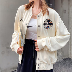 韩国东大门刺绣可爱贴布时尚灰色长袖立领棒球服卫衣女...