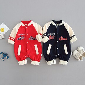 新生婴儿连体衣服满月男宝宝纯棉秋冬加绒保暖外出棒球...
