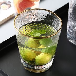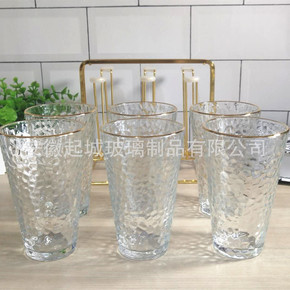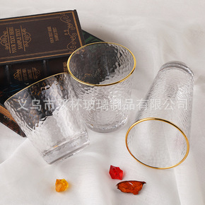 欧式浮雕玻璃杯菱形花纹果汁杯餐厅圆形金边水杯高脚酒...
