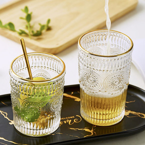 北欧韩式复古浮雕金边玻璃太阳花水杯家用果汁牛奶饮料...
