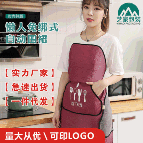 现货批发免绑式自动围裙防水防油防尘韩版时尚家用围裙...