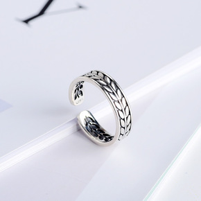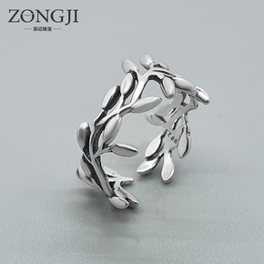 S925纯银 复古做旧橄榄叶戒指 简约树叶树枝泰银...