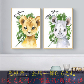 北欧小清新水彩可爱动物豹子长颈鹿马儿童房沙发背景墙...