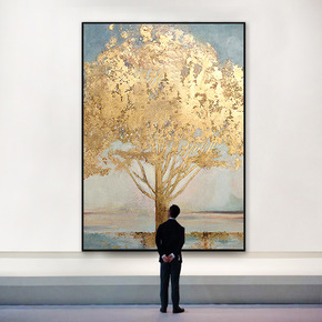 手绘发财树装饰画客厅大尺寸背景墙油画样板间大气金箔...