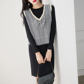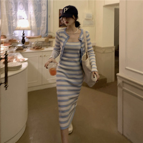 秋款套装女时尚气质甜辣风修身显瘦针织吊带连衣裙+短...