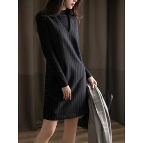 条纹毛呢背心连衣裙女秋冬宽松外穿优雅气质v领坎肩马...