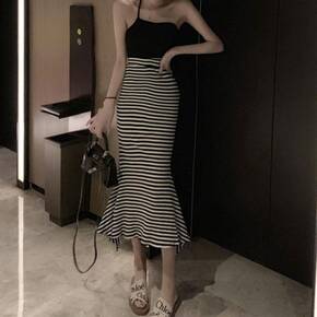 2022夏季新款港味性感时尚裙子女高腰条纹开叉鱼尾...