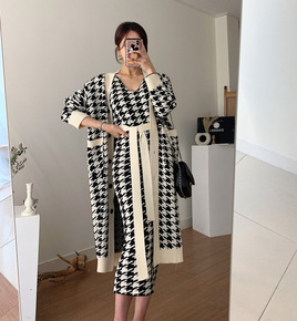 韩国chic法式小众秋冬装慵懒风V领长款针织毛衣+...