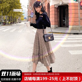 毛呢半身裙女2021秋冬新款中长款格子呢子裙高腰A...