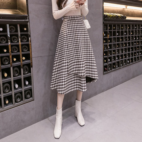 毛呢格子裙半身裙秋冬新款高腰显瘦中长款a字裙包臀开...