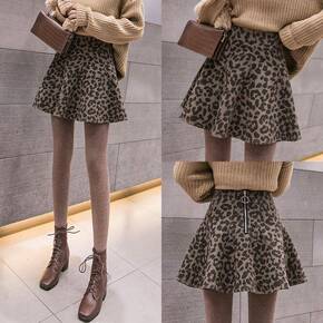 伞裙秋冬防走光豹纹短裙毛呢裙半身裙春秋新款韩版蓬蓬...