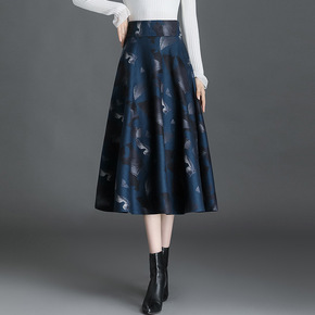 毛呢印花半身裙女2021秋冬新款高腰中长款a字百褶...