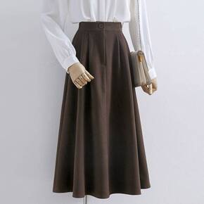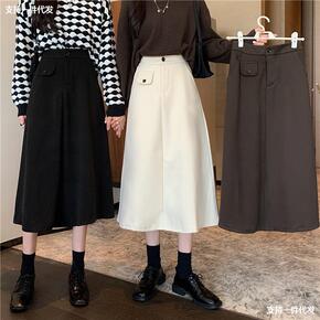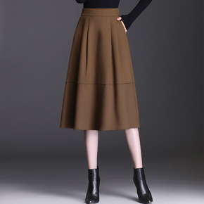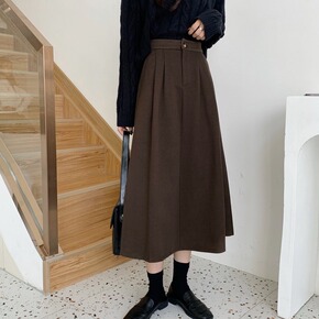 2021秋冬韩版新款学院风高腰中长款大摆A字裙毛呢...