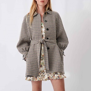 法单20秋冬新款英伦收腰系带灯笼袖千鸟格双面呢大衣...