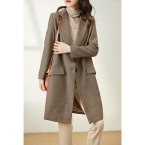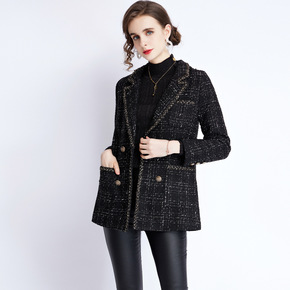 秋冬衣服女士 西装领长袖编织格子中长款 粗花呢外套...