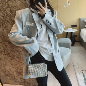 小千鸟格纹亮片西装小外套女2021春季装新款宽松时...