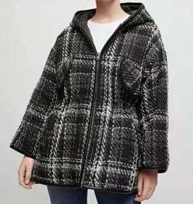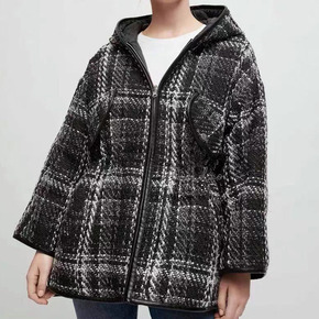 法单M家秋冬新款女装两面穿粗花呢黑白格纹连帽拉链棉...