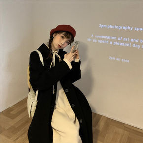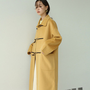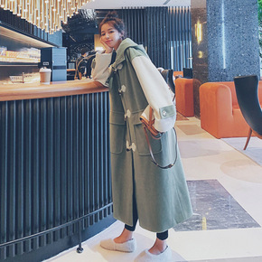 牛角扣中长款学院风呢子大衣女秋冬加厚过膝直筒纯色长...