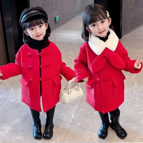 女童毛呢外套秋冬季中长款红色202新款中大童装洋气...