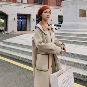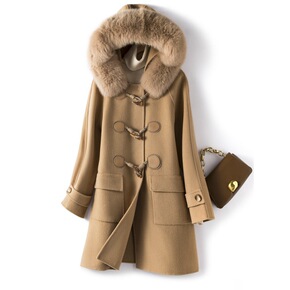 秋冬双面羊绒大衣女中长款驼色牛角扣大毛领学院风新款...