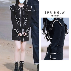 黑色珠边中长款外套女小个子2022年新品高端呢子大...