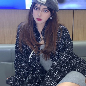 小香风粗花呢毛边毛呢外套女春季2022新款宽松中长...