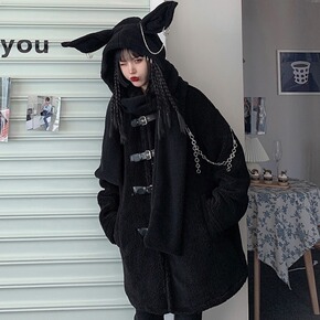 秋冬复古加厚保暖毛绒兔耳朵棉衣原宿风暗黑宽松中长款...