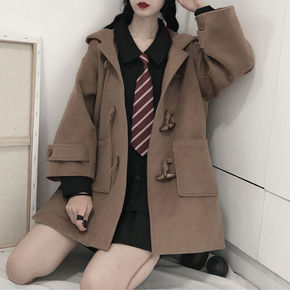 秋冬新款韩版学院风日系牛角扣毛呢外套女宽松学生小个...