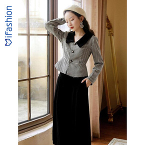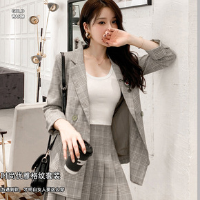 复古千鸟格西装外套+百褶裙半身裙两件套装女装202...