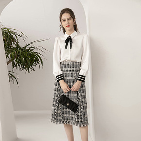 2020秋冬新款时尚套装女装纯白衬衫+粗花呢格子流...