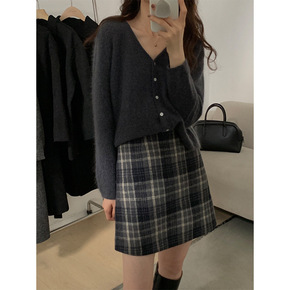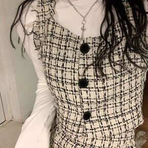 秋冬款名媛小香风粗花呢格纹短款马甲+高腰显瘦短裙时...