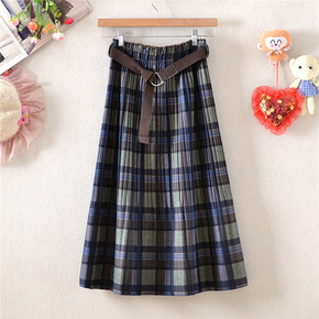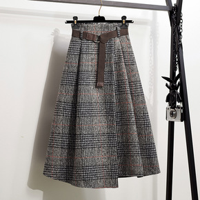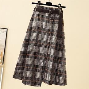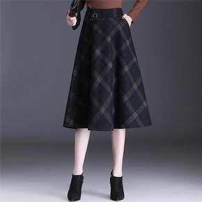 毛呢夏裙女半身裙高腰中长款格子过膝长裙春秋季新款包...