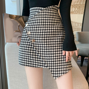 出笛不规则高腰千鸟格毛呢半身裙时尚秋冬新款性感百搭...