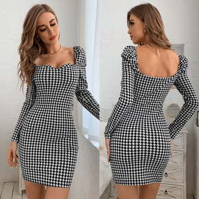 2021秋冬新款千鸟格一字领长袖裙子气质显瘦优雅毛...