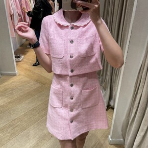 法单S家 21秋冬粉色假两件小香风娃娃领粗花呢连衣...