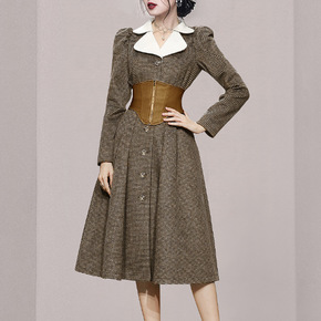 跨境连衣裙2021秋冬季新款韩版双排扣修身千鸟格包...