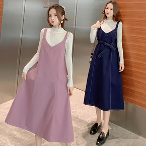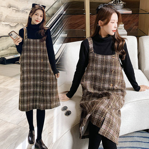 2020秋冬新款千鸟格孕妇哺乳中长款毛呢背带裙两件...