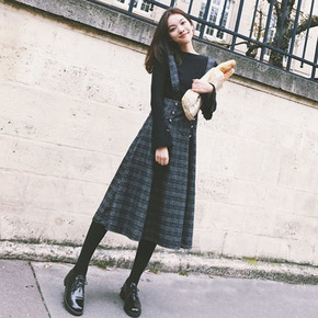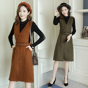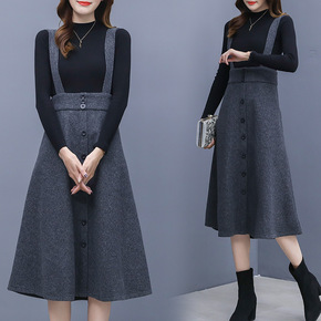 香港2020秋冬新款长袖上衣背带裙两件套毛呢连衣裙...