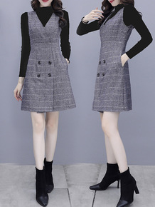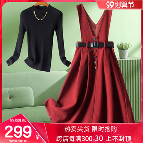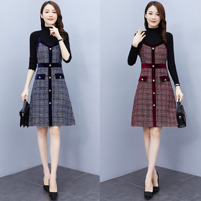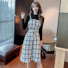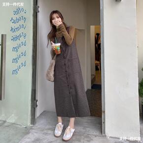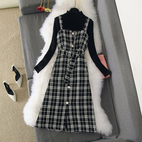 2021秋装新款针织打底衫时尚单排扣格子吊带中长裙...