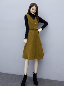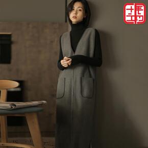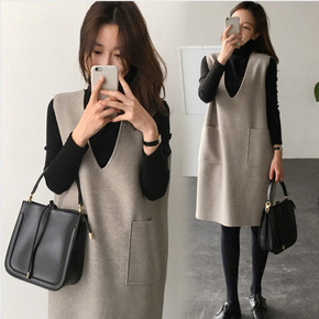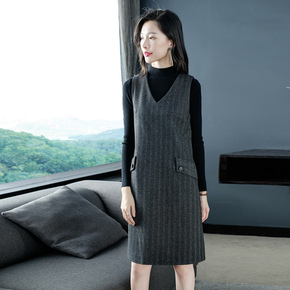 无袖V领中长款修身毛呢A字背心呢子连衣裙打底衫两件...