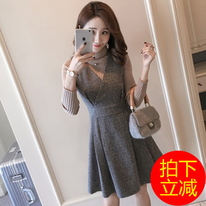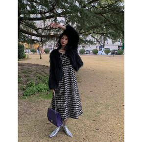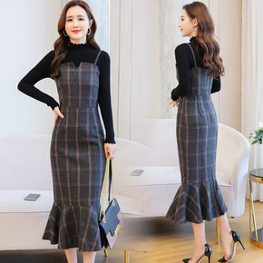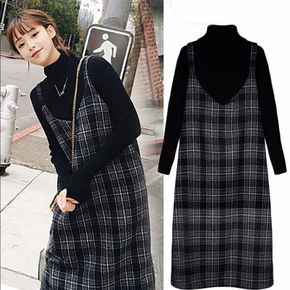单件套装秋冬新款女装复古格子吊带裙毛衣长款过膝毛呢...
