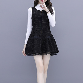 现货无袖毛呢格子鱼尾网纱拼接背心连衣裙打底短裙两件...