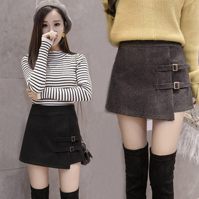 实拍秋冬新款大码女裤假二件毛呢短裙裤胖MM高腰宽松...