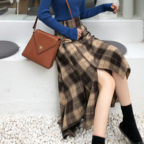 格子毛呢半身裙秋冬中长款复古宽松过膝洋气开叉不规则...