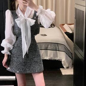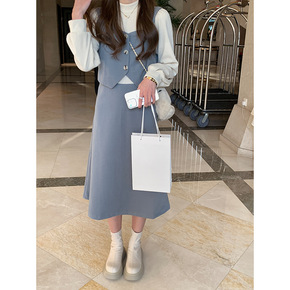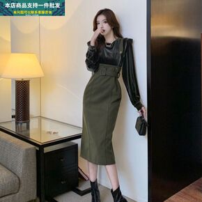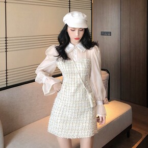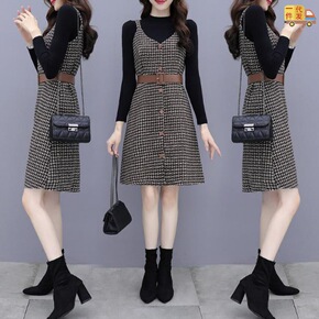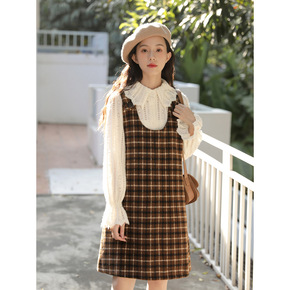 2021秋冬新款女装毛呢背带裙套装显瘦收腰格子气质...