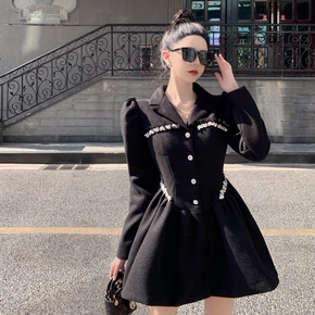 2022早春新款镶钻A字蓬蓬裙收腰夹棉加厚泡泡袖毛...