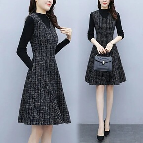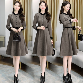 毛呢连衣裙女春秋2021新款气质收腰减龄显瘦格子加...